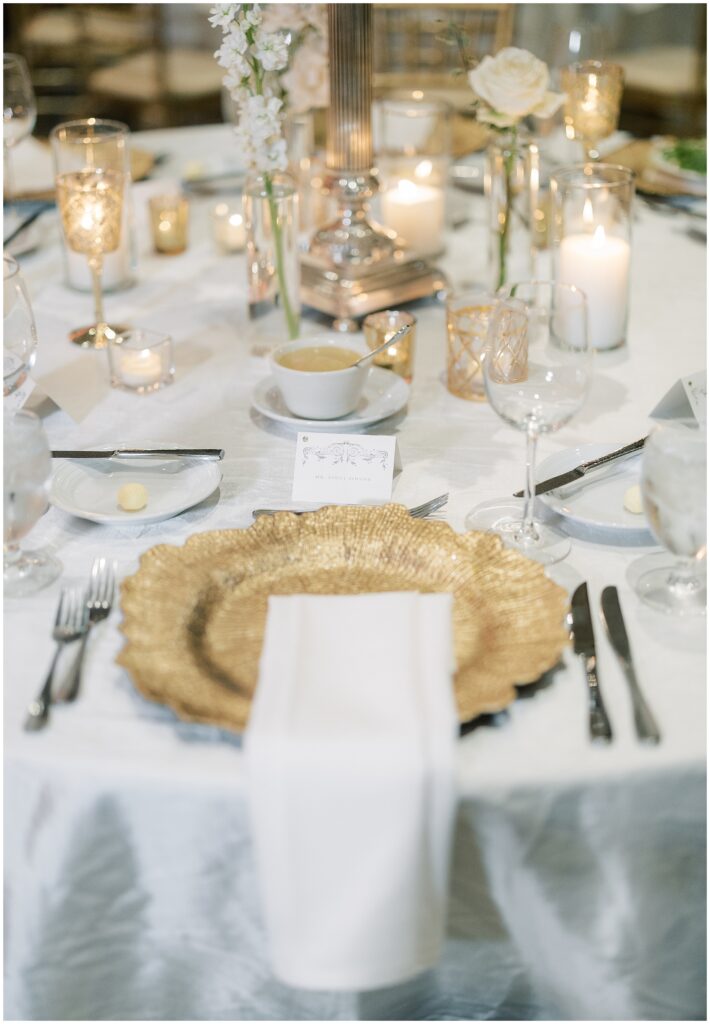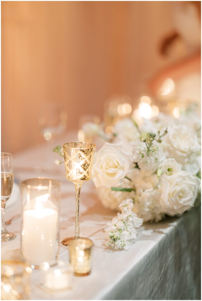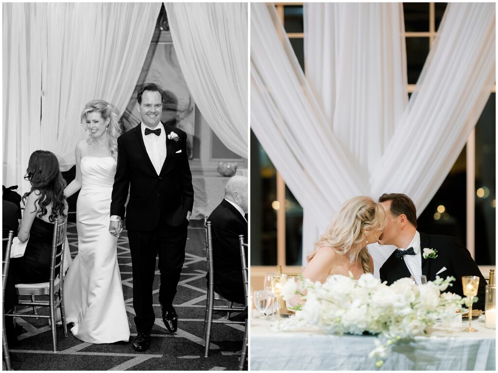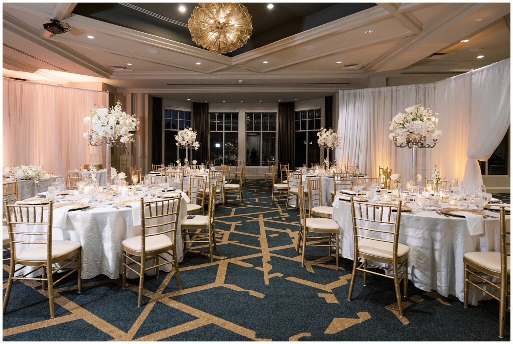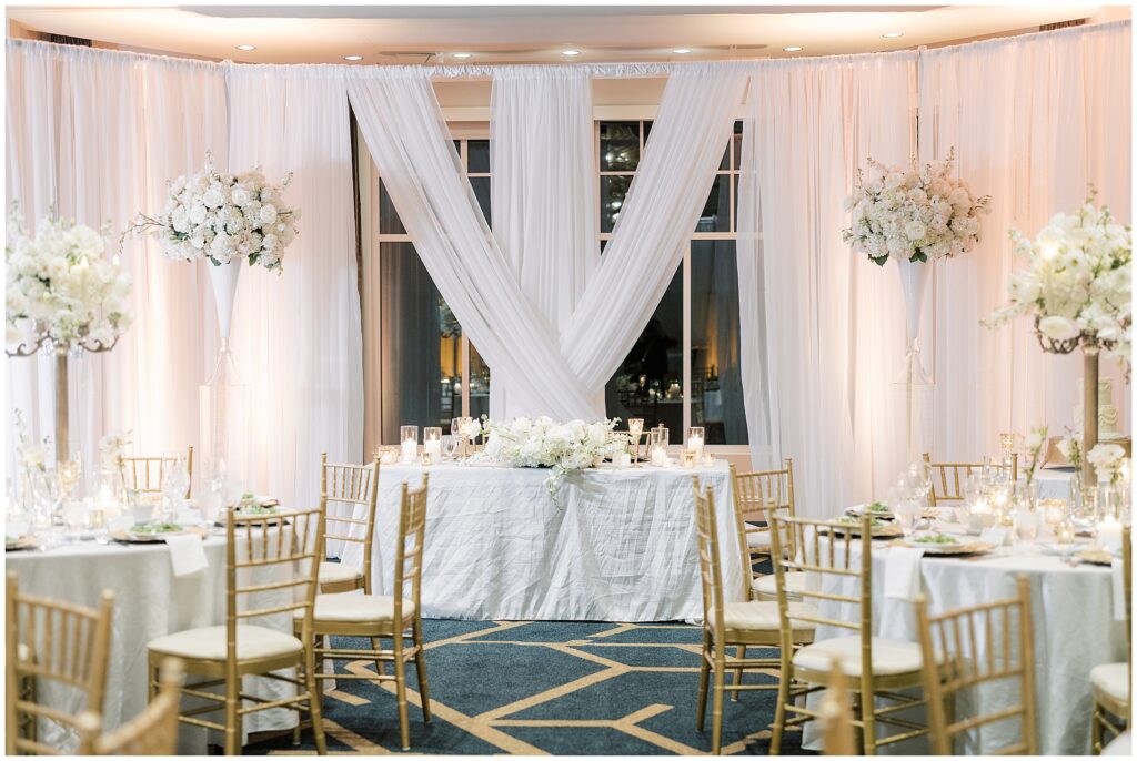 As guests made their way from cocktail hour to reception, flowing drapes framed the entryway, transforming the ballroom into a serene oasis. The color palette was soft and refined – creamy whites layered with gentle textures that felt classic in the best way.