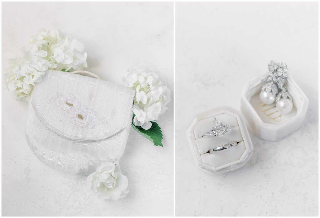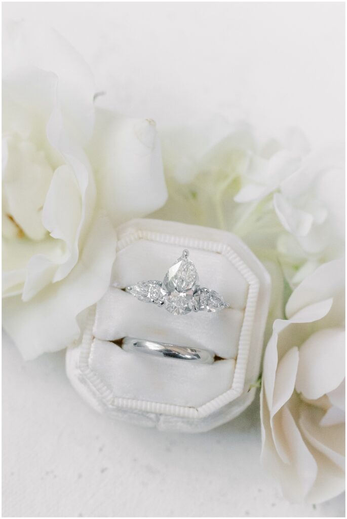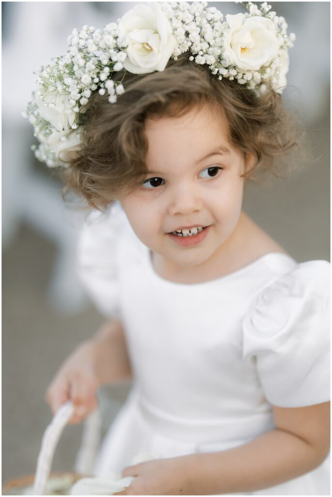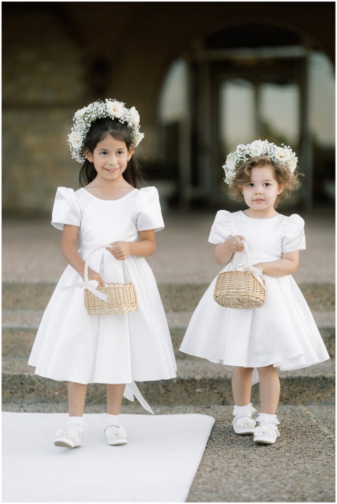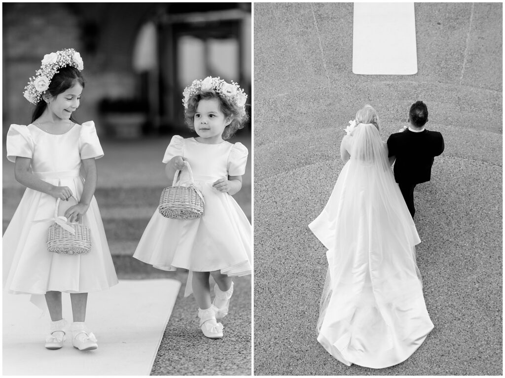 As guests made their way from cocktail hour to reception, flowing drapes framed the entryway, transforming the ballroom into a serene oasis. The color palette was soft and refined – creamy whites layered with gentle textures that felt classic in the best way.