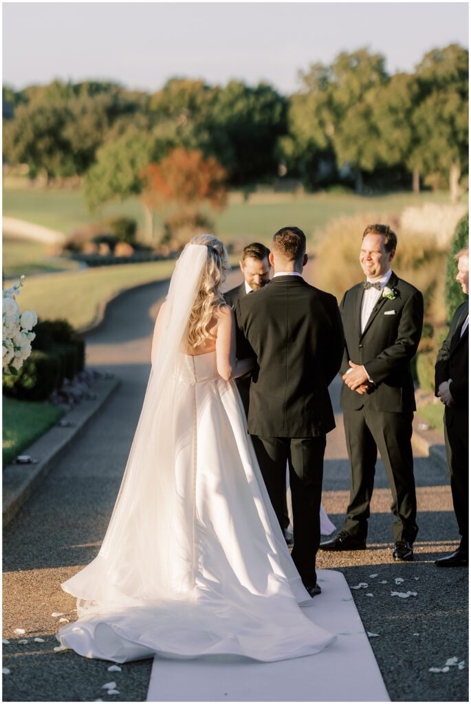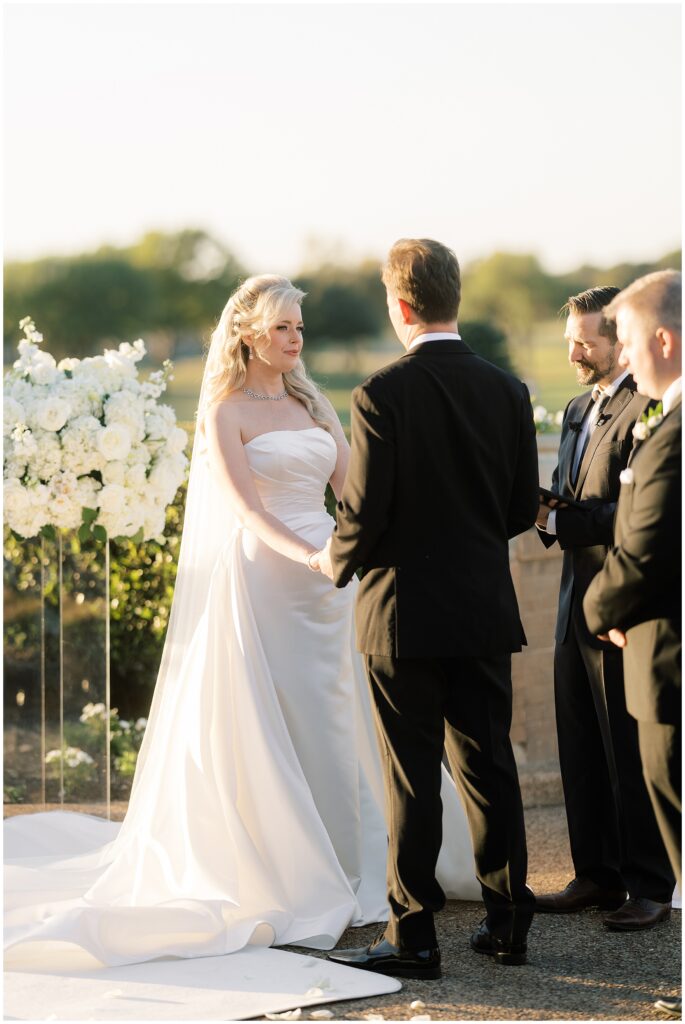 The ceremony took place outdoors, set against the lush green of the golf course.. Framed by pillars of winter white florals, the space felt both intentional and effortless. The greenery stretched endlessly behind them, creating a peaceful, almost garden-like backdrop as sunlight filtered through the blooms. The natural beauty of the setting gently held the moment without stealing the spotlight.